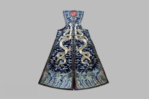 皇太后和皇后的朝褂颜色为石青色,片金边缘。绣文为前后各两条立龙,下摆有四层相间的褶皱设计,上面是四条正龙,下面则是万福万寿的纹样。领后垂下的带子使用明黄色,珠宝的装饰恰到好处。